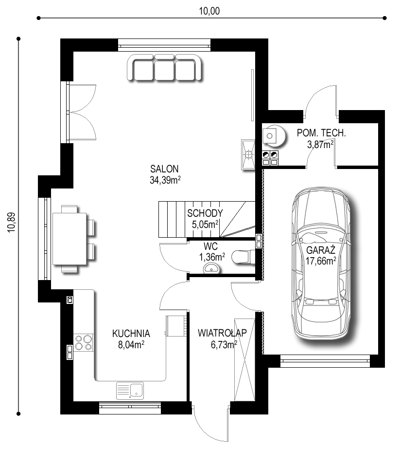 Rzut parteru – 77,10m2: